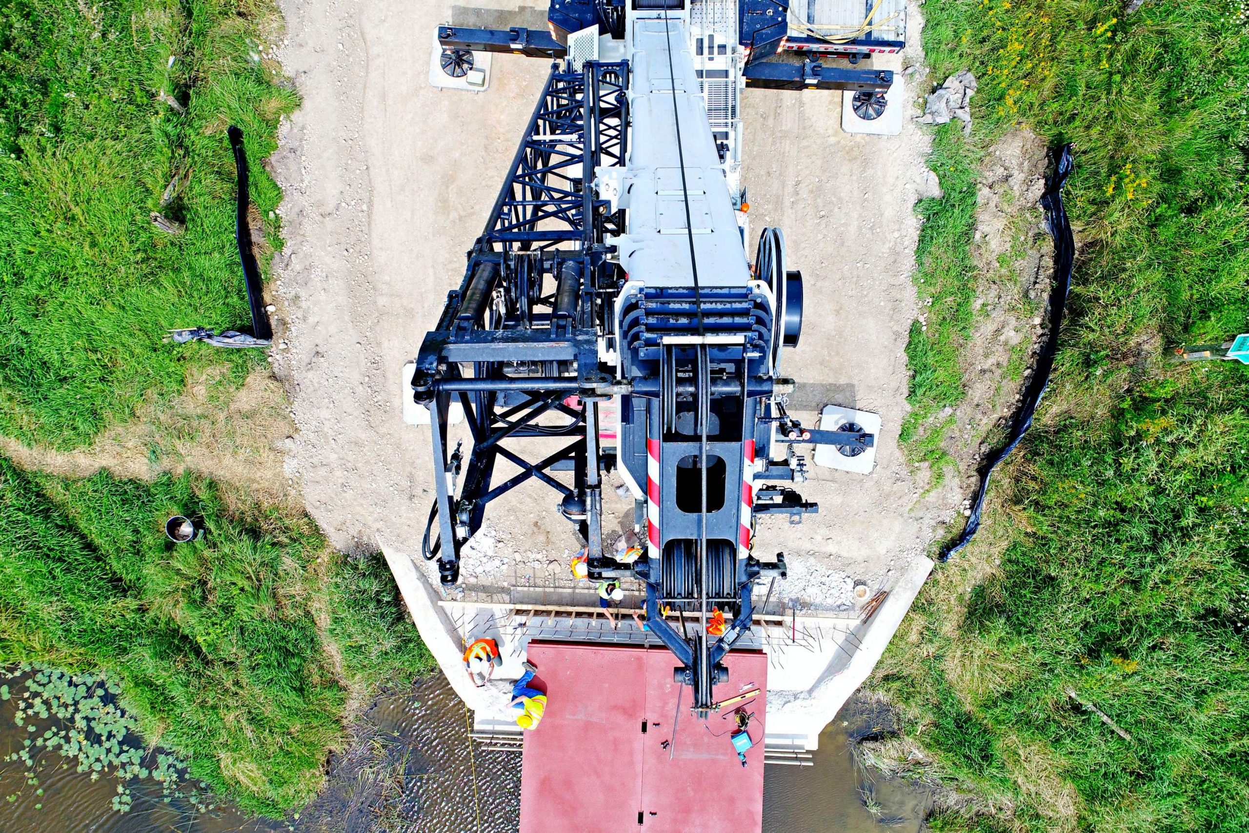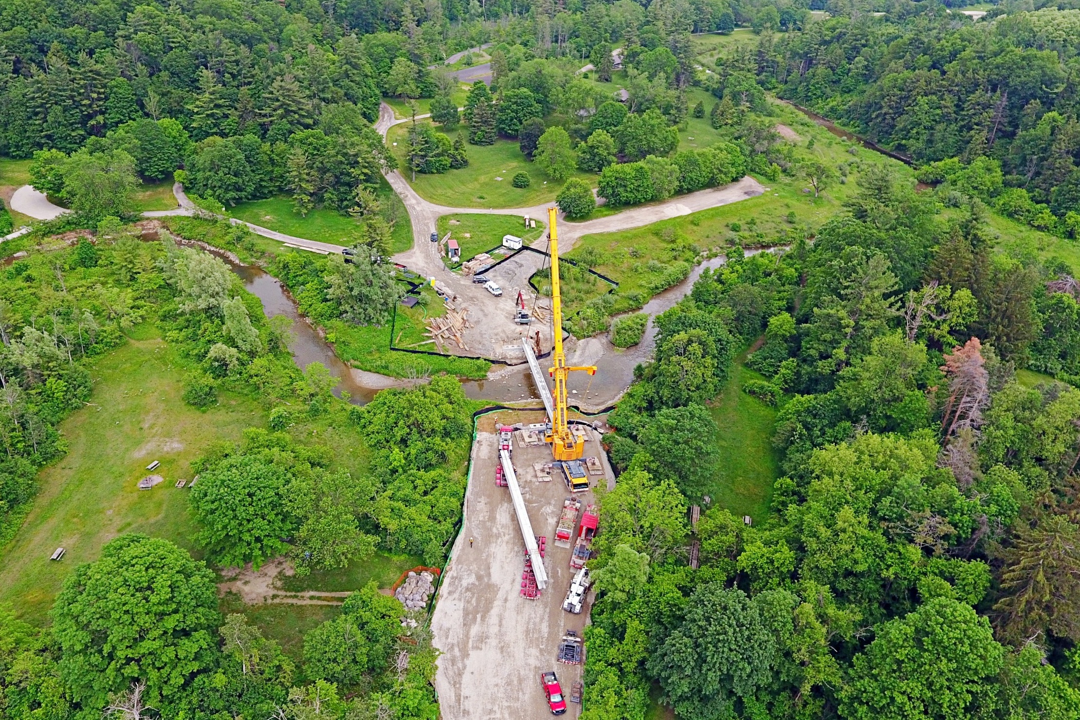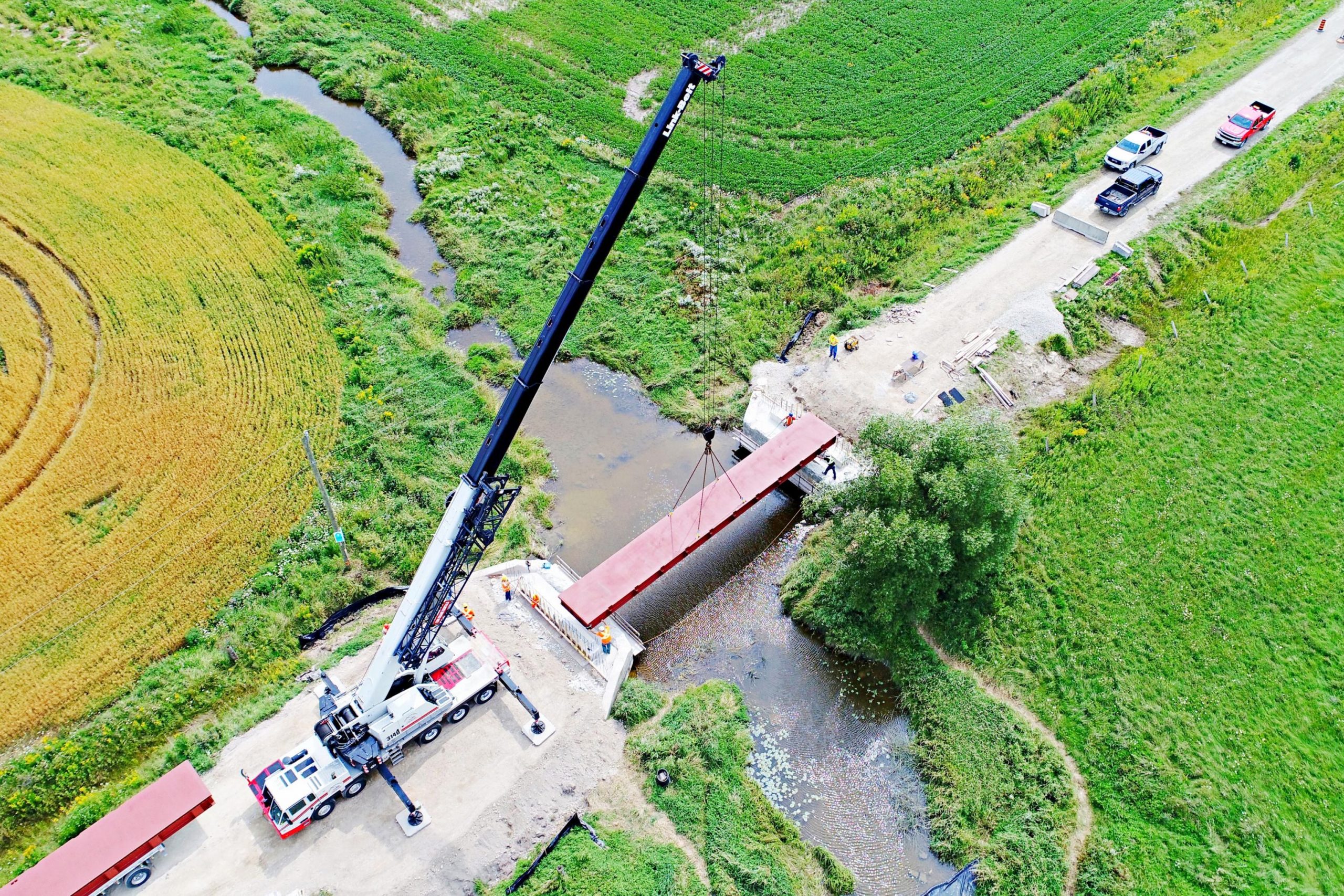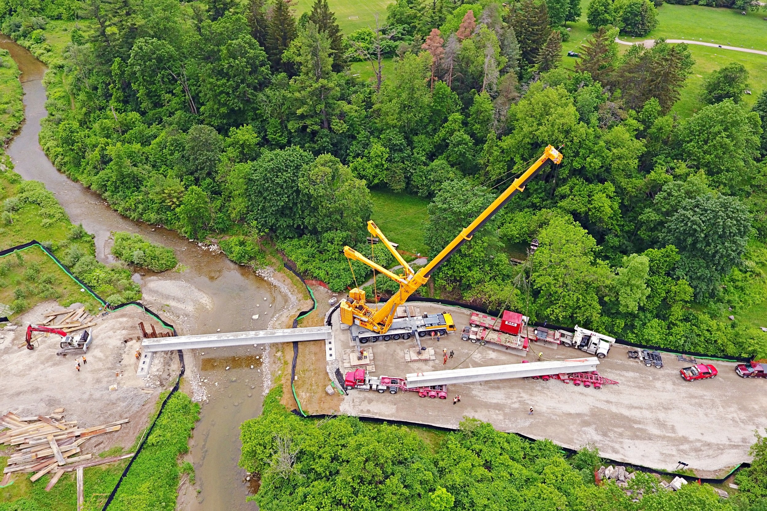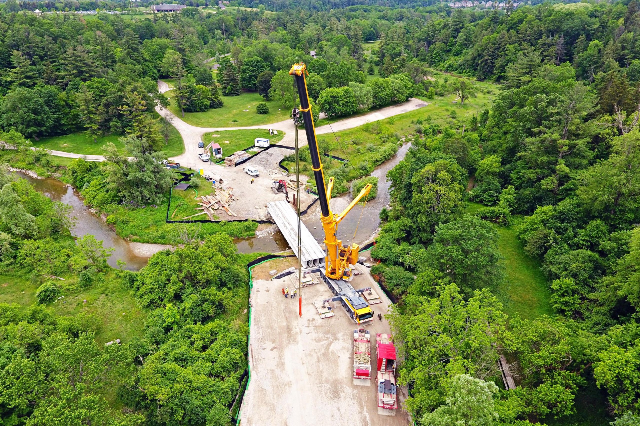 - These aerial shots record the bridge construction process on a highway and in a park;